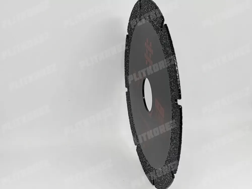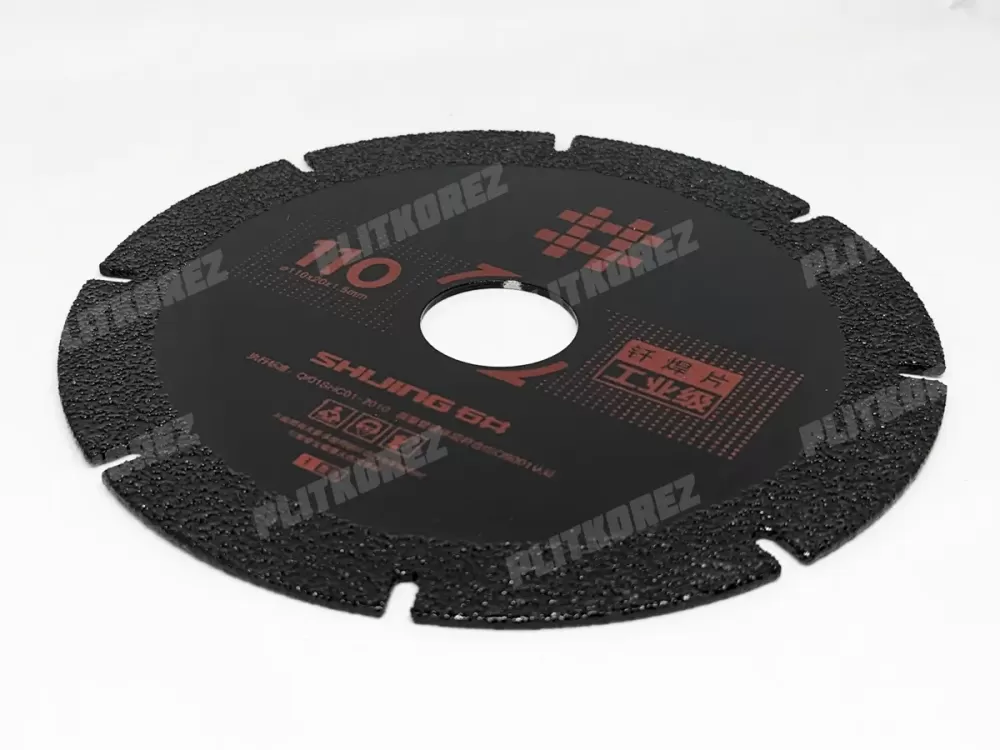 Диск алмазный Shijing 110 мм. Производится в Китае на заводе Shijing, одном из крупнейших кстати в стране. Благодаря узкому форм-фактору и толщиной режущей части всего 1,5 мм, этим диском легко можно разрезать не только обычную красную глину (керамическую плитку), но и каленый, плотный керамогранит (керамогранитные плиты), при том сделать это деликатно и аккуратно. Пусть Вас не пугает его черный цвет, это всего лишь защитное покрытие от коррозии металла, сами алмазы нанесены равномерно по всей кромке диска. Высота алмазной "крошки" составляет целых 12 мм. А его специфическая структура с прорезями через определенные промежутки расстояния, мелкой алмазной крошкой, помогает делать рез ровным, отводя лишний мусор (как бы выгребая его из канавки), и лучше охлаждать диск. Диск можно использовать как без воды (на "сухую"), так с водой.
