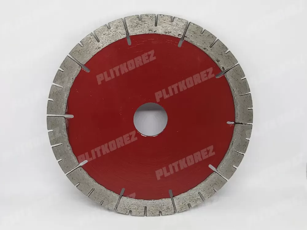 Диск не тонкий, его толщина составляет - 1,8 мм, структура диска разбита на 10 больших сегментов, каждый из которых в свою очередь имеет по 3 дополнительные прорези. Такая структура хорошо как бы "выгребает" мусор из канавки реза, помогает лучше охлаждать диск потоками воды, вода проникает не только слева и справа от диска, но еще и проливается в прорези, что в большей степени охлаждает диск, и препятствует преждевременному износу алмазов. А самый главный враг всех алмазов - это чрезмерный перегрев.