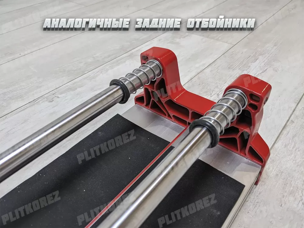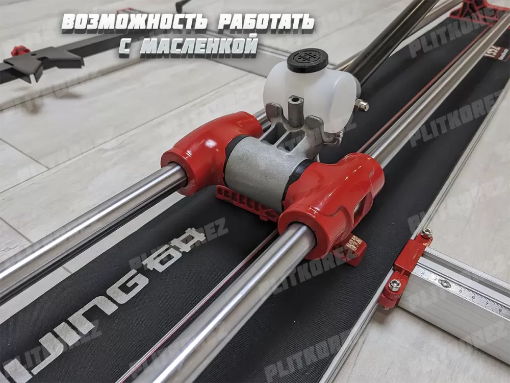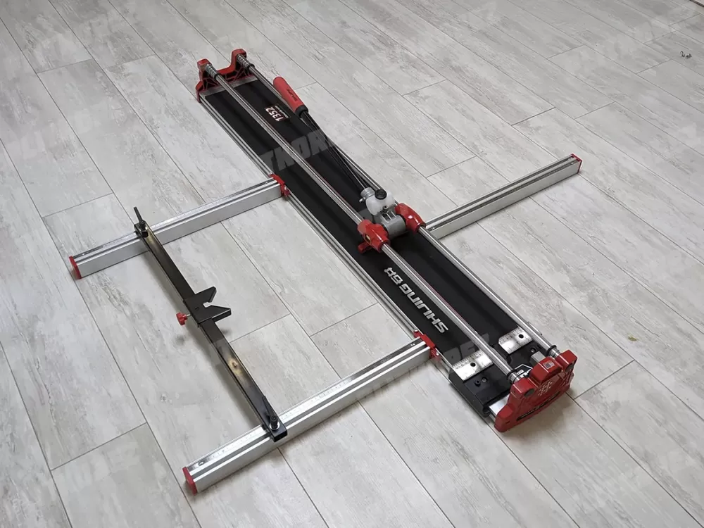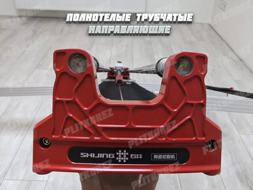 Плиткорез Shijing 1352, модель на двух рельсах, аналогичная модели Diam Extra Line twin 1250L и RUBI TIGER-1200 (чем то похож на Rubi Hit-1200). Диаму соответствует полностью по конструктиву, так как делаются на одном заводе (разница лишь в названиях), с Руби есть отличия, так как Rubi это Итальнский бренд, а Shijing 1352 его неплохая копия собранная из качественных материалов китайским производителем. Пусть не пугает Вас первый взгляд и его строение состоящее из двух трубок, они не пустотные бутафорские как на тех же зубрах, матриксах, вихрях и прочих брендов. В Shijing 1352 трубки полнотелые, даже я бы сказал не трубки, а трубы, по 2 см каждая в диаметре, и имеют весьма солидную жесткость, при этом выполнены из нержавейки. Данный плиткорез незаслуженно недооценен на рынке СНГ именно из-за его внешнего вида (из-за двух трубок), которые у многих ассоциируются с некачественными китайскими изделиями. Увидев его вживую хоть раз, все сомнения в его эффективности сразу улетучатся. Тем более он обладает рядом преимуществ по сравнению с тем же Shijing 3751 (DLT maxline 1200): возможность ювелирной настройки глубины реза, полный обзор при резе, демонтирующаяся рукоять, закрытого типа подшипники от пыли и грязи, стойкие к коррозии и более долговечные направляющие. При этом качество и способность реза плитки у него ни чем не хуже, чем у Shijing 3751, он так же легко справляется с любой керамической плиткой, и практически любым керамогранитом большого формата.