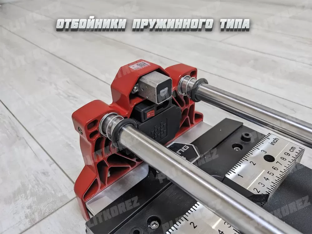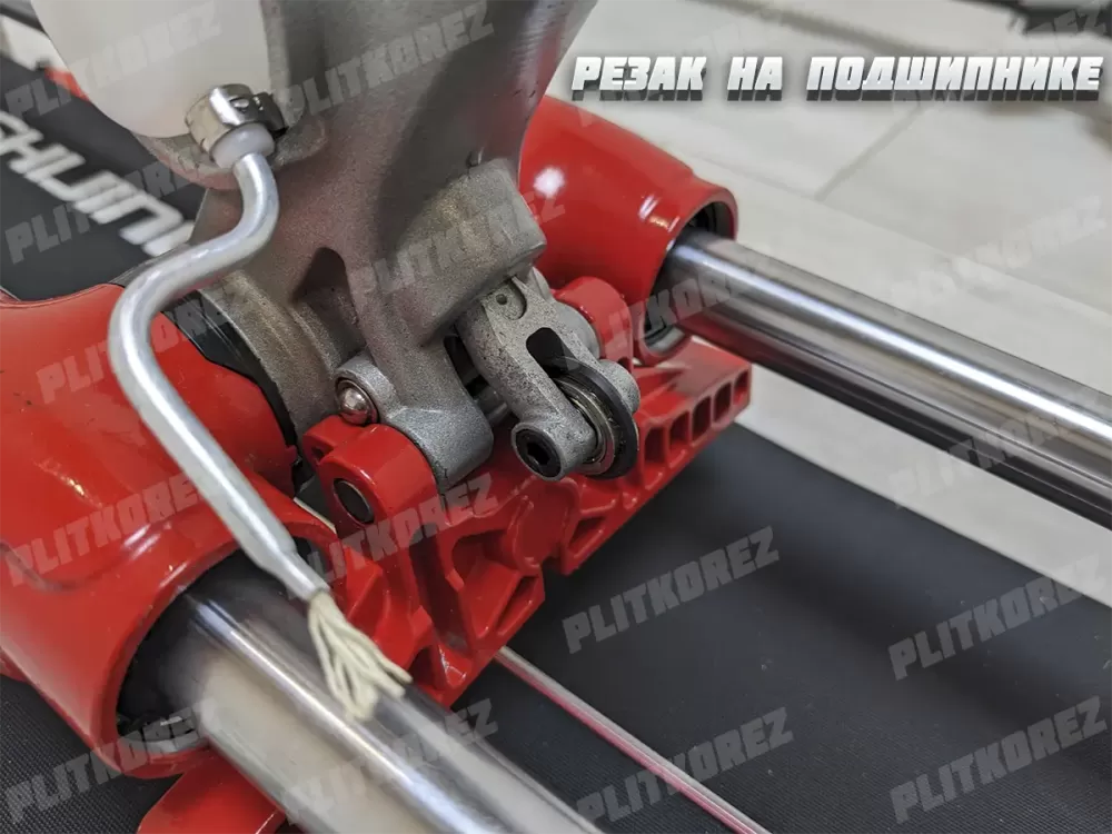 - самое главное отличие, у Shijing 1352 используется 2 направляющих трубы по 20 мм, полнотелых, из нержавеющей стойкой к коррозии стали, у Shijing 3751 одна из легированной стали, в форме пустотной трубы размером 4 х 2 см с толщиной стенки 3 мм. У каждой конструкции свои плюсы и минусы. Так у модели Shijing 1352 лучше устойчивость к боковым прогибам, благодаря наличию соответственно двух направляющих, но они уступают в вертикальной жесткости одному монорельсу из-за его более крупного размера и прямоугольного строения (жесткости больше на прогиб вверх вниз, чем влево вправо). При этом металл более качественный используется у трубчатого плиткореза, он устойчив к влажной среде и имеет подшипники закрытого типа на каретке, вообщем не боится грязи и пыли как монорельсовый вариант;