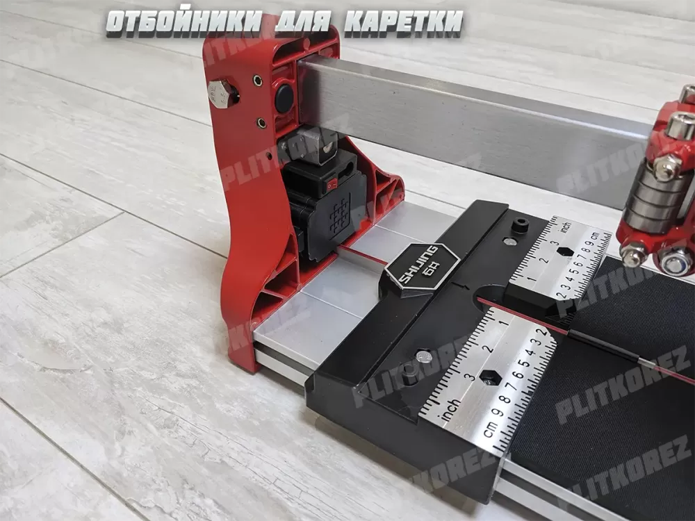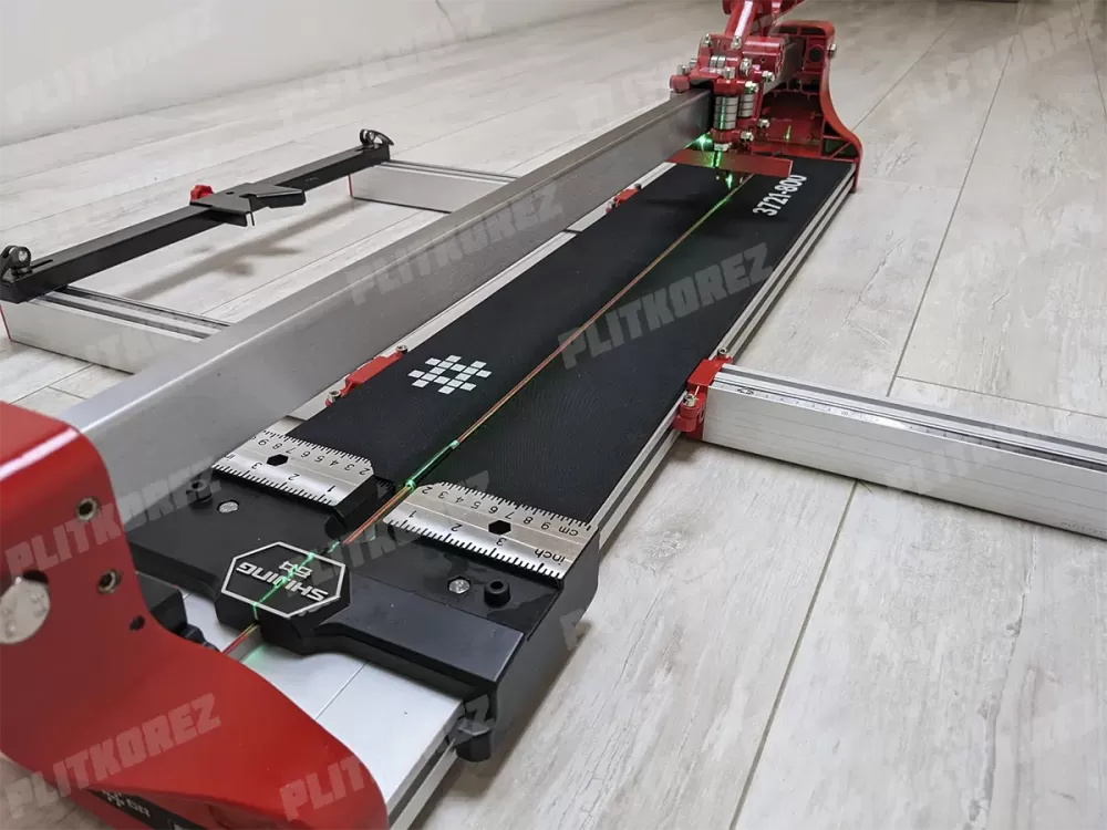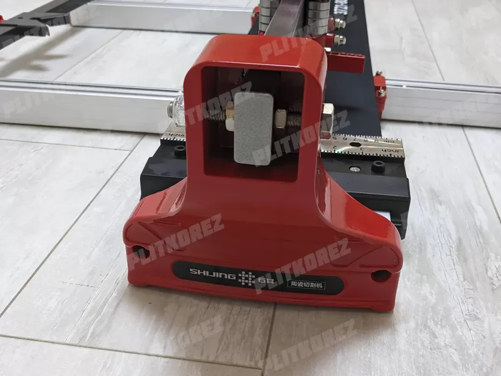 - Ну и напоследок не маловажным преимуществом плиткореза Shijing 3721 перед тем же Shijing 3022, при том что они оба на 800 мм, явлется то что на модели 3721 можно работать с плиткой 60 х 60 см для реза по диагонали ! Из за более продуманной конструкции каретки и резака, а так же торцевых планок, в которых каретка как бы углубляется, длина реза увеличивается до 870 мм, что как позволяет разрезать 60ую плитку по диагонали, длина которой составляет ~85 см.