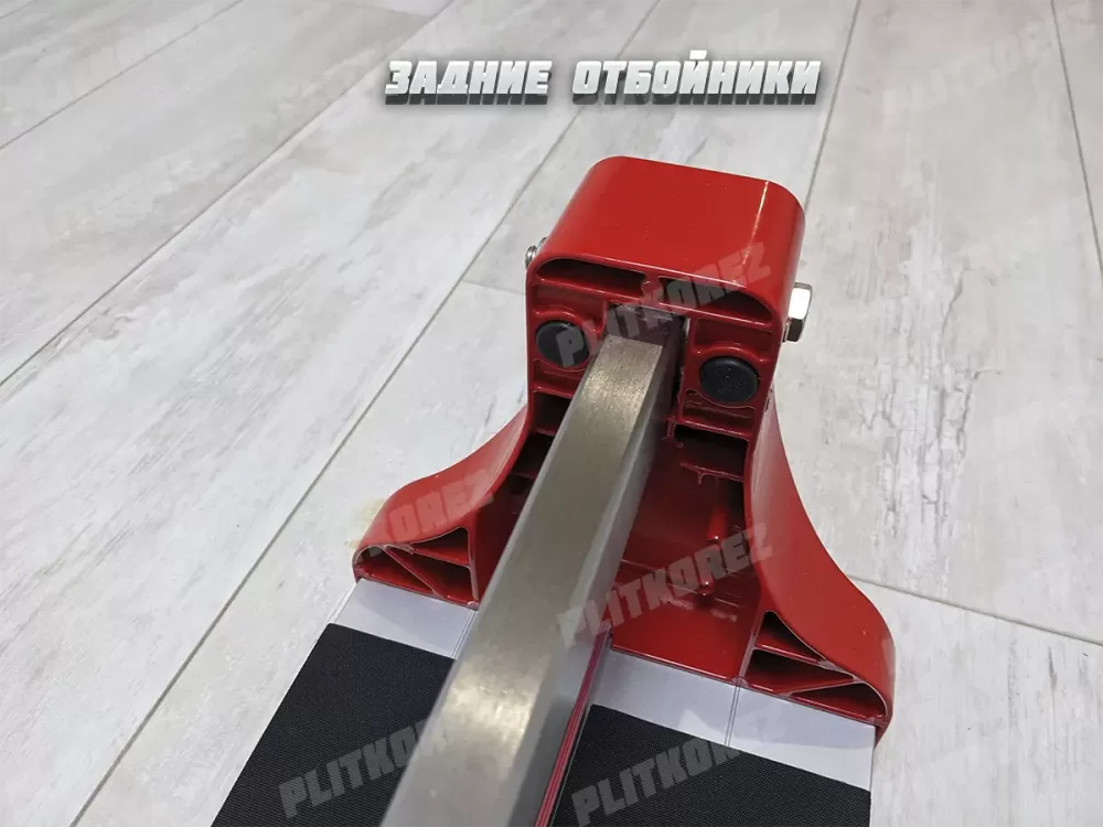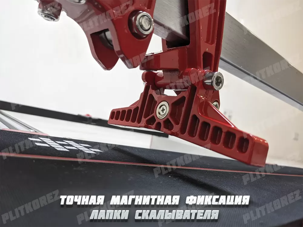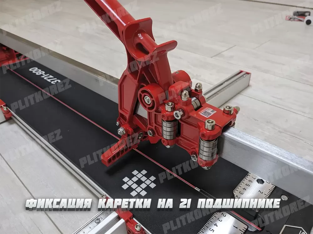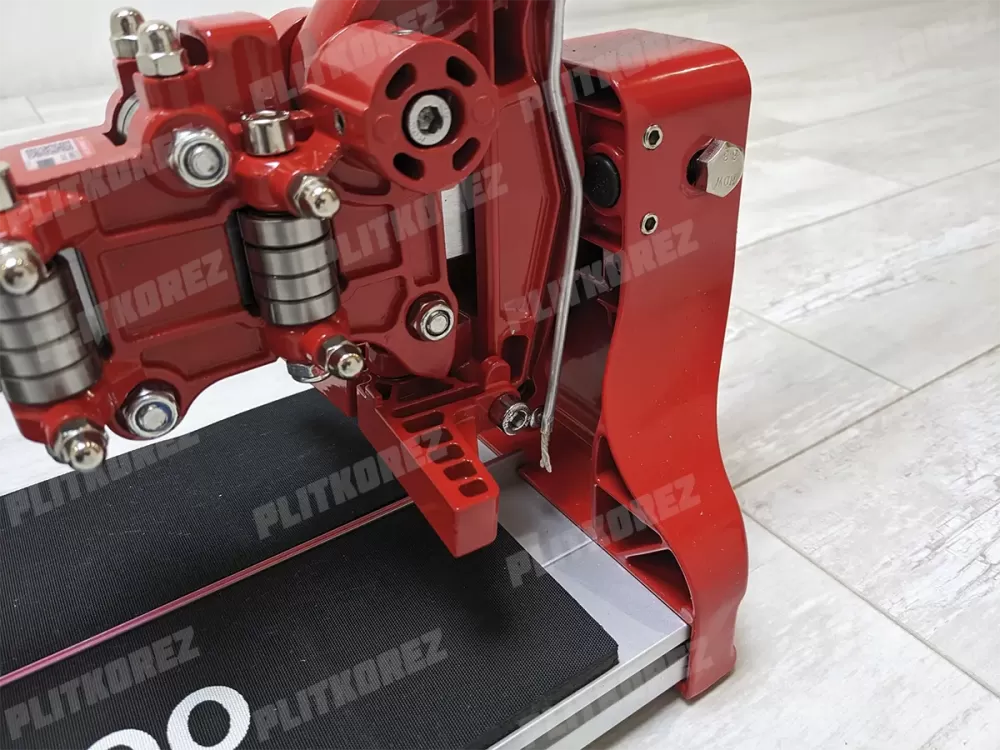 - Каретка имеет особенность независимого хода от рукояти. Рукоять расположена на отдельной оси с резаком и лапкой скалывателя. Тем самым скольжение каретки происходит только в одном положении - вдоль направляющей, что приводит к меньшему износу направляющей со временем. Ход рукояти возможен только строго вверх-вниз. В строении каретки уже используется 21 подшипник, в отличии от 20ти в других моделях. Сама каретка в целом имеет другой конструктив. Отличительной особенностью является расположение режущего ролика, он находит позади лапки скалывателя, что увеличивает обзорность и делает удобство надлома плитки в любой части плитки. Что же касается лапки скалывателя, то можно отметить ее фиксацию на каретке с помощью магнита. В отличии от более старых версий, где происходила фиксация с помощью подшипника, не всегда срабатывающего, и разбалтывающегося со временем. Теперь же удержание лапки скалывателя интуитивно понятное, удобное, и четко срабатывает, можно работать одной рукой, что увеличивает производительность в работе и снижает энергозатраты. Работать одно удовольствие.