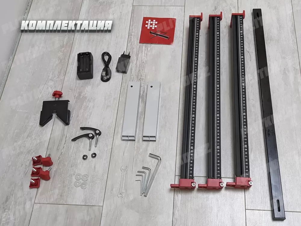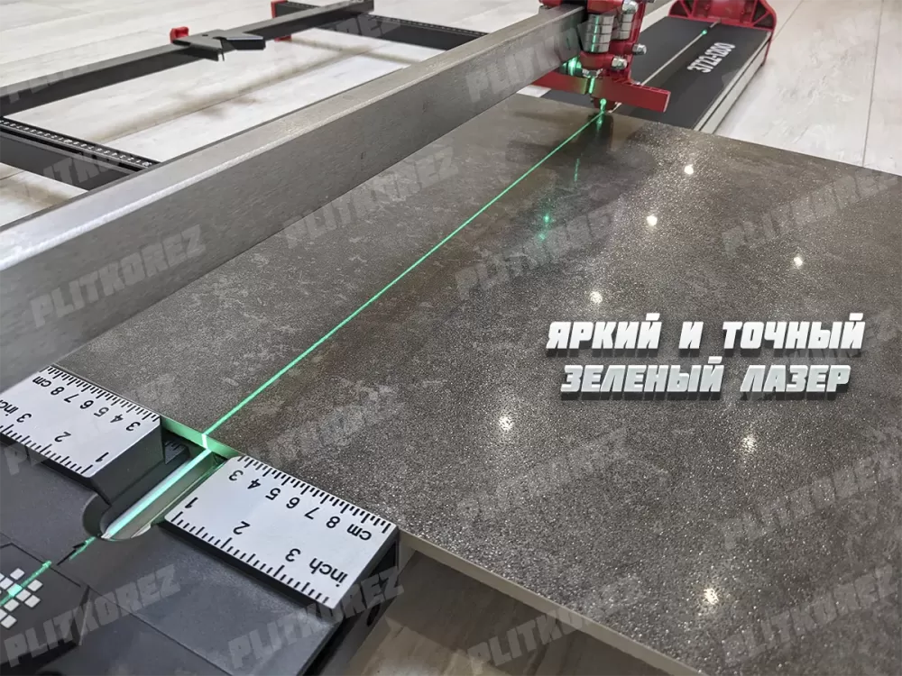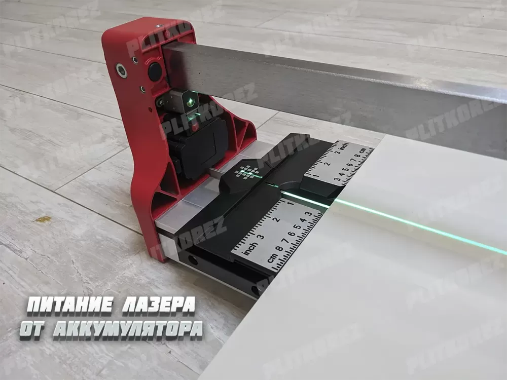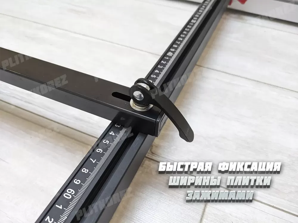 Кроме того, в комплекте есть так же черная металлическая поперечная планка, которая крепится на двух лапах стола, и позволяет задать необходимый размер плитки для реза по ширине. Для этого выставляется нужный размер по шкале линеек двух лап, проверяется дополнительно линия реза с помощью яркого и точного зеленого лазера (по умолчанию он уже установлен и точно настроен). Если размер на линейке и линия реза на плитке совпадают как нам нужно, то планка фиксируется зажимами с двух сторон, для предотвращения ее смещения во время реза.