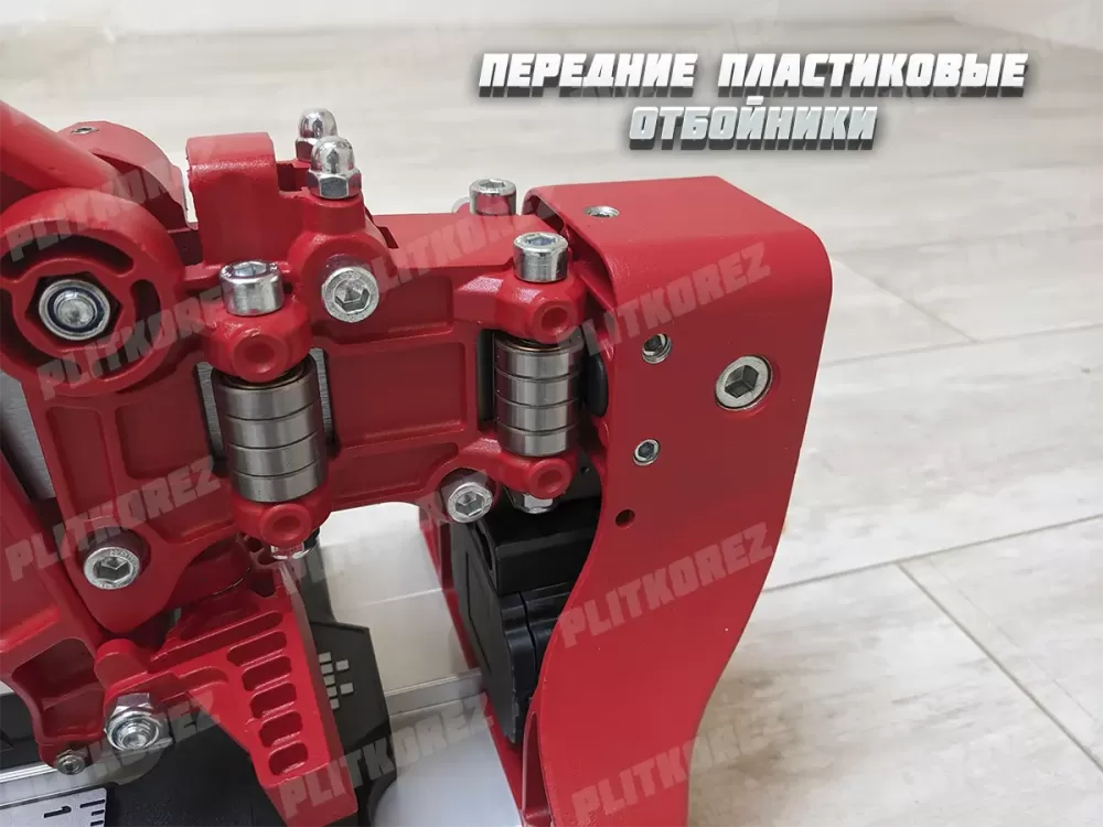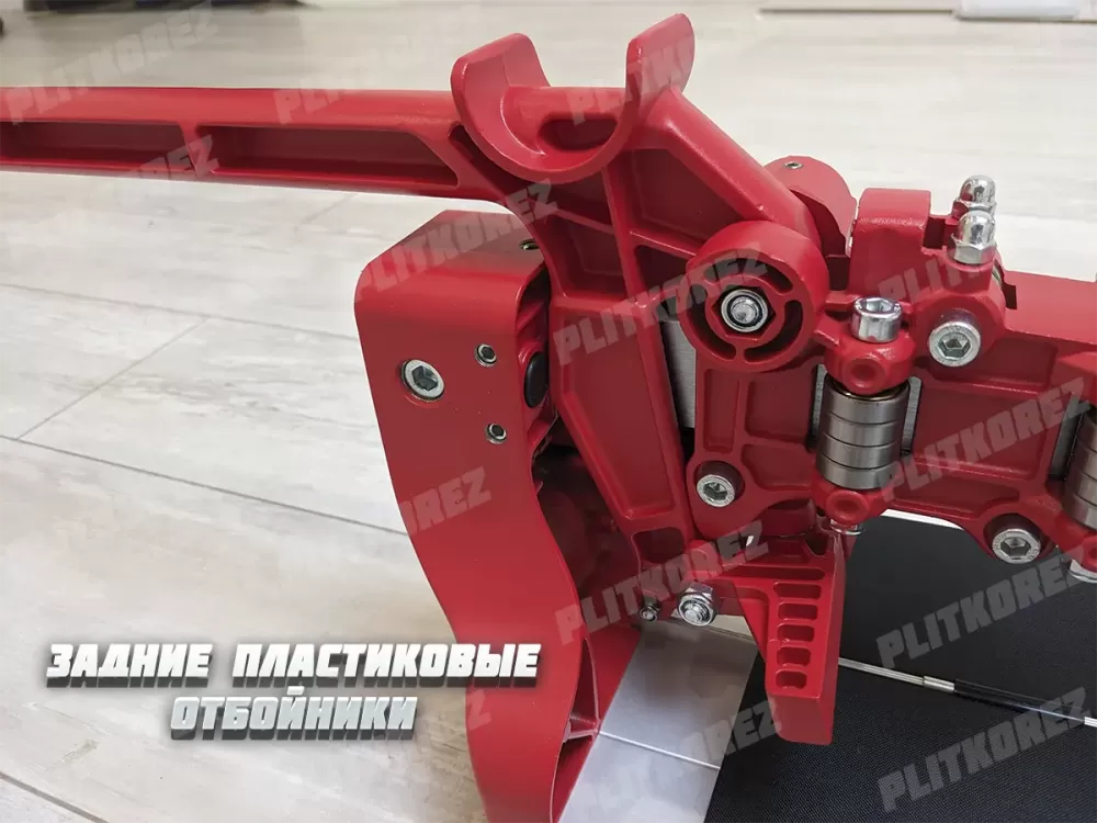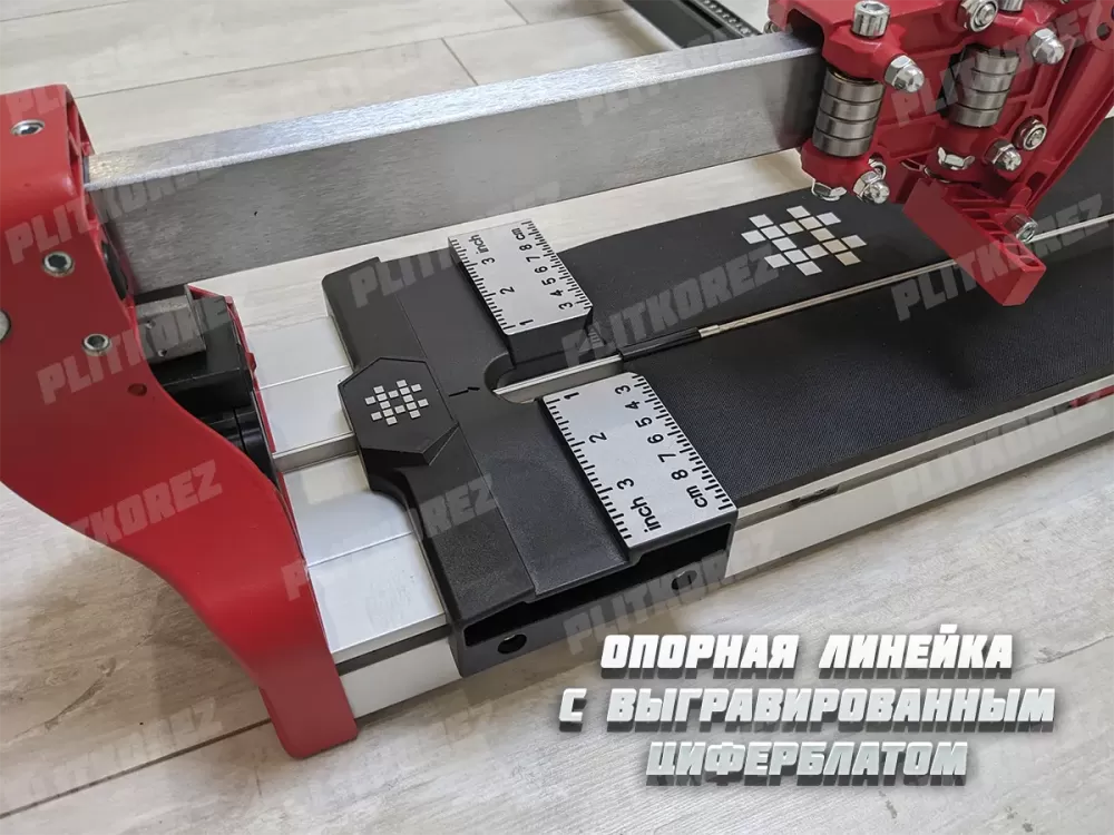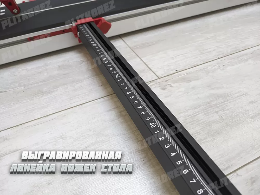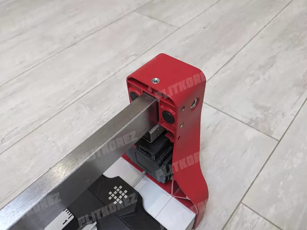 Каждая из трех лапок стола (2 с одной стороны и одна с другой) выполняют роль поддерживания плитки, а так же для ее точной разметки. Для реализация этой функции в каждой ножке стола есть встроенная линейка, с выгравированным белым циферблатом на черном матовом фоне. Фиксация же лапок к столу осуществляется с помощью одного зажимного болта. Необходимо совместить 2 ушка каждой лапы стола и одно ухо перемещающихся салазок на плиткорезе. Совместив отверстия, шестигранным болтом происходит стягивание элементов, а дополнительными болтами с красными пластиковыми ручками лапки стола фиксируются точно перпендикулярно платформе.