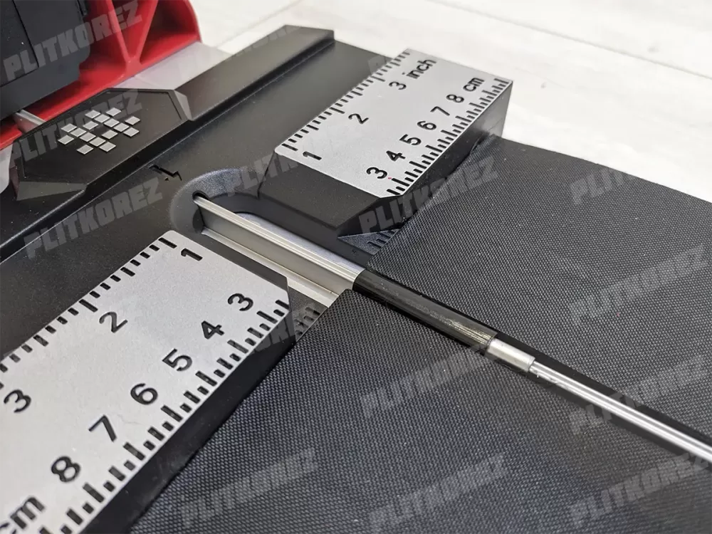 - Опорная разметочная линейка в моделе 3722 стала пластиковой, в моделе 3751 она была стальной с выгравированной шкалой. В плане износа это плохое и не надежное решение, из плюсов можно лишь отметить отсутствие скалывания плитки об острые углы металла, при плотном контакте;