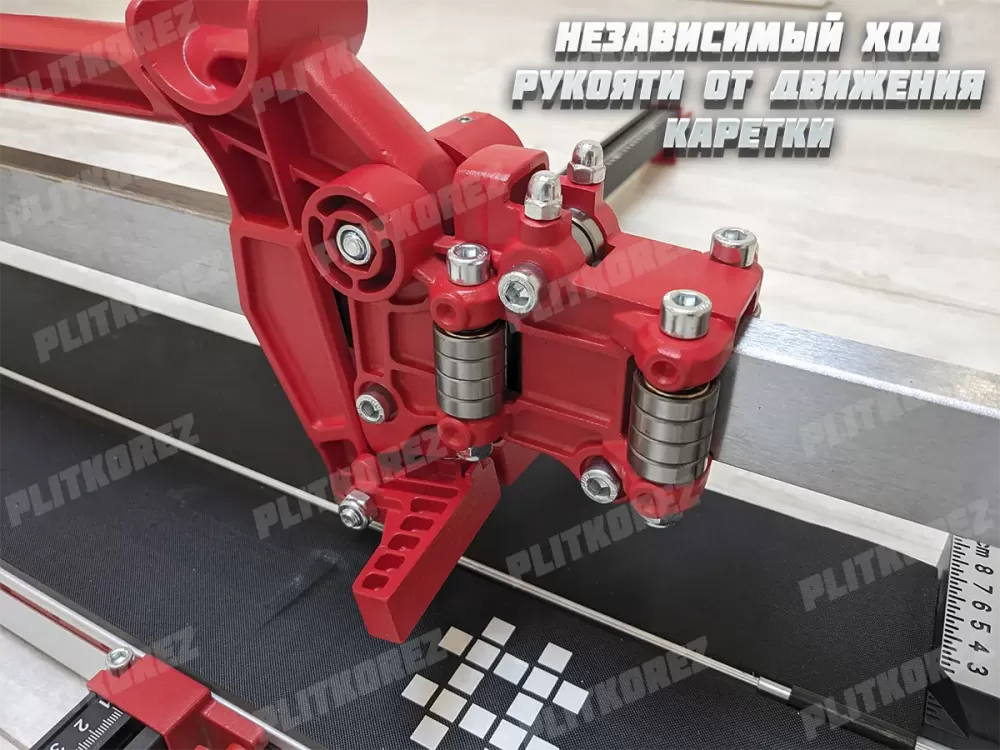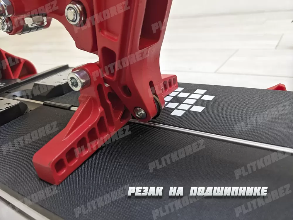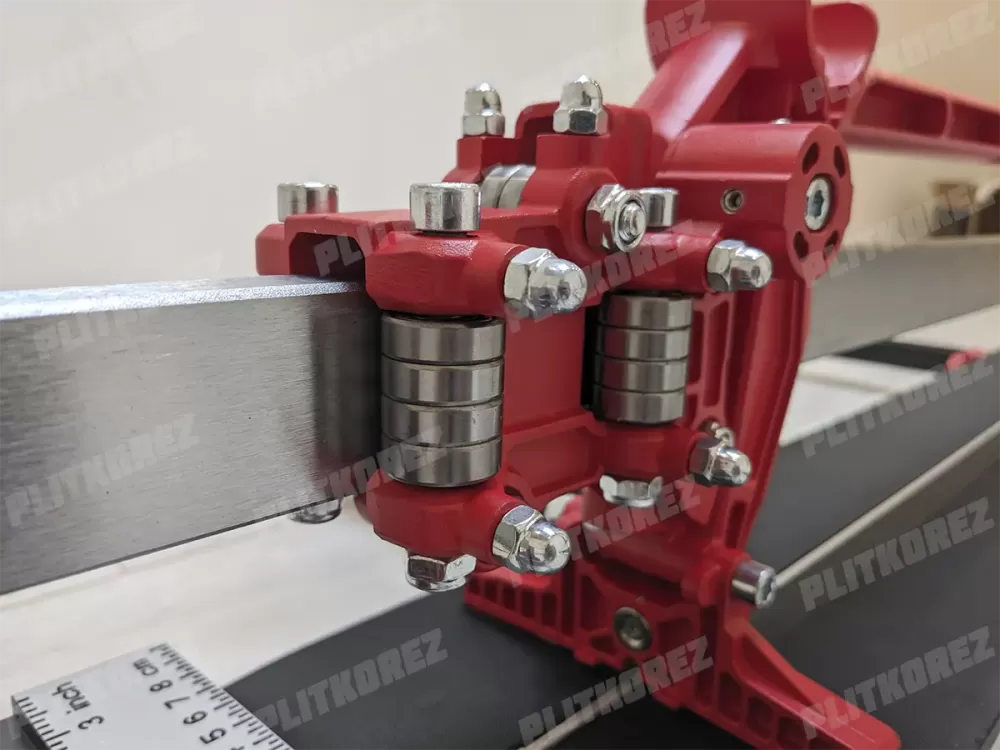 Рез происходит без лишних трудностей и усилий. Главный принцип - если прорезается верхний слой плитки (так называемая "глазурь"), то дальше уже дело техники, разломить оставшуюся обожженую глину. В плиткорезе Shijing 3722 каретка зафиксирована на направляющей с помощью 21 подшипника, по 4 + 4 подшипников слева и справа, 2 сверху и 3 снизу, а рукоять движется на отдельной "оси", что обеспечивает надежность конструкции и отсутствие люфтов.