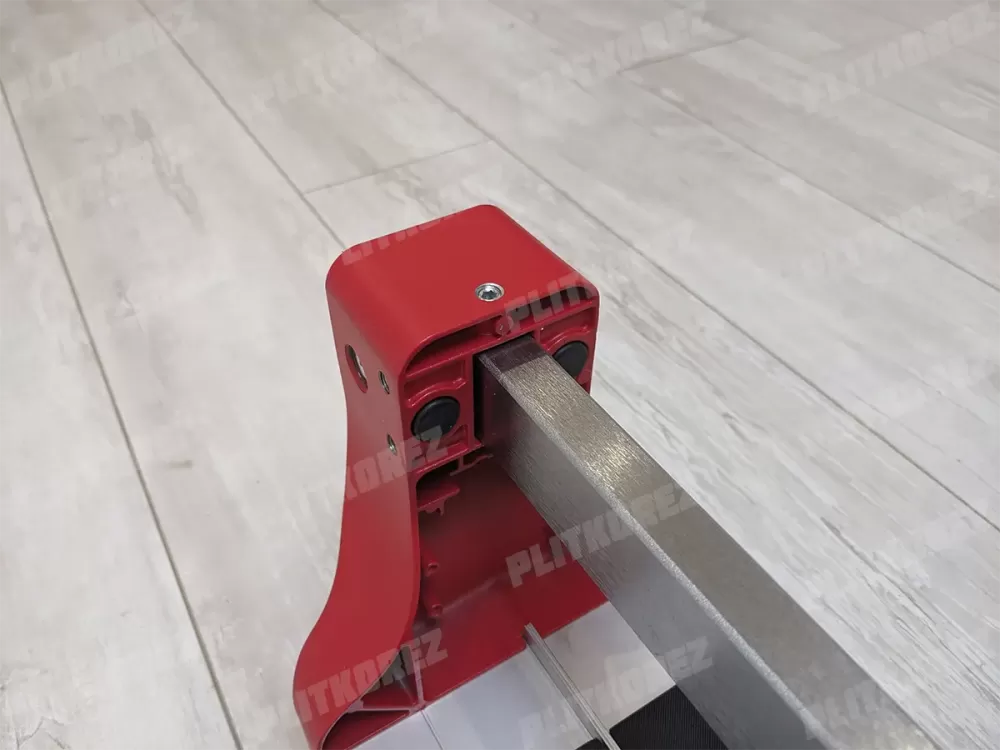 Для угловых резов в комплекте с плиткорезом присутствует так называемый М-образник. Название происходит от его формы похожей на букву "М". Принцип работы с ним предельно прост. Фиксируется элемент поджимным болтом с красной пластиковой ручкой на поперечину лапок стола. Перед фиксацией соответственно нам нужно примерить вставку плитки в него, так, что бы плитка одновременно под углом плотно вставлялась и в М-образник, и в специальную выемку на опорной линейке расположенной в передней части плиткореза, прямо перед лазером, на платформе. Совместив пазы, выставляем под лазер плитку под необходимый рез.