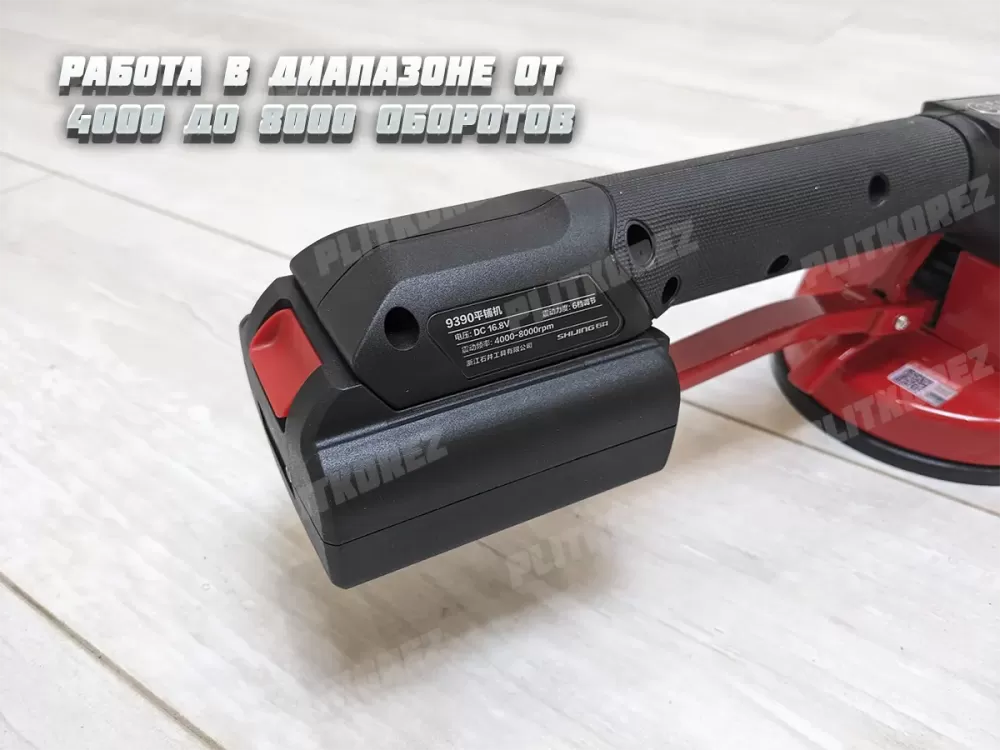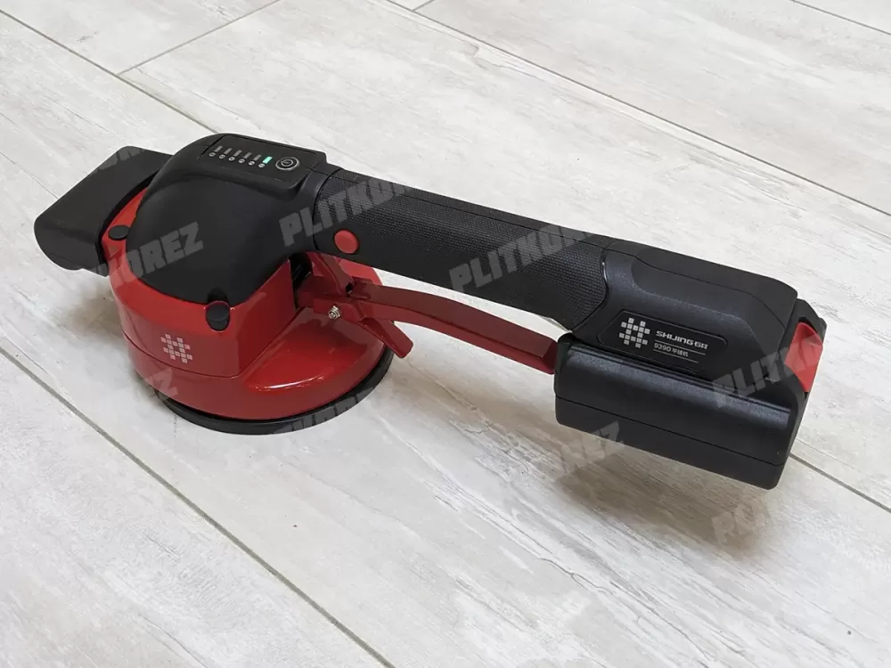 Виброприсоска аккумуляторная Shijing 9390. Облегчает процесс укладки (утапливания в плиточный клей) керамической плитки (кафеля), керамогранита, мрамора, камня. Позволяет равномерно и акцентированно распределять раствор под плиткой, удаляя все ненужны пустоты без лишних усилий. Ускоряет работу с широкоформатным керамогранитом 60х120 и бОльших размеров, в среднем на 30%. Шесть различных режимов интенсивности вибрации, от небольшой до взрывной, диодный индикатор режима работы, удобная прорезиненная рукоять которая гасит вибрацию, идущую от инструмента, удобный хват, возможность транспортировки плитки присасыванием, или коррекции после чрезмерного утапливания. Два сменных аккумулятора, заряда которых хватит чуть ли не на пол года работы. Инструмент сочетает в себе сразу 2 функции: вибратор и одинарную ручную присоску (как Shijing P610). Корпус металлический, крепкий. Резиновое основание долговечное и практичное в использовании. Удобная прорезиненная подставка для возможности работы двумя руками, ей же кстати можно вибрировать для точечного утапливания нужного предмета. Защита от воды и раствора на крепежных болотах и кнопки старта вибромотора. В целом очень качественное изделие от ведущего китайского производителя. Виброприсоска Shijing 9390 незаменима в современном строительстве, для тех кто ценит свое время и здоровье (спина и руки Вам скажут спасибо).