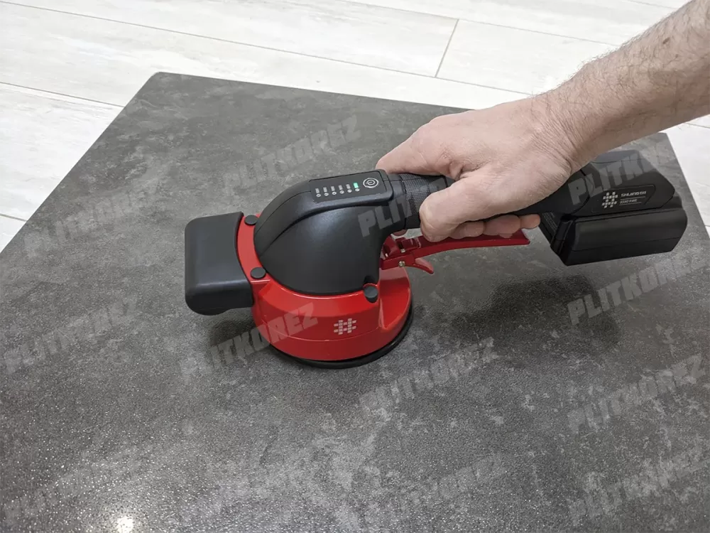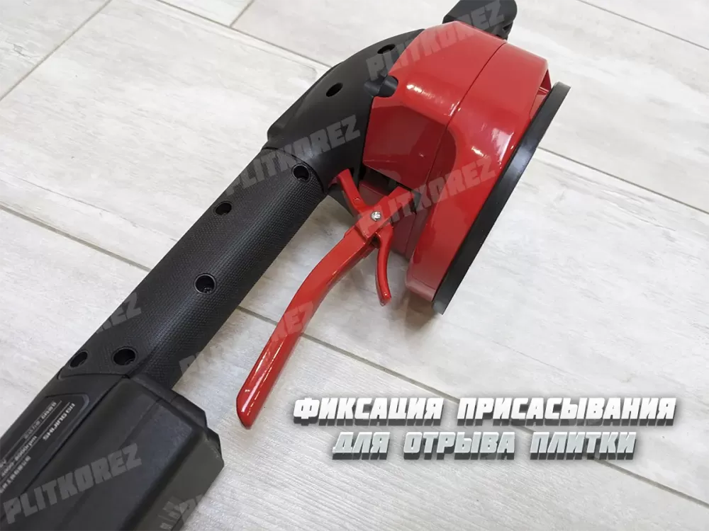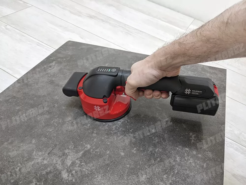 Для переноса предмета, плитки, в том числе, убедитесь что его поверхность гладкая, чистая, без пыли и мусора. Разместите виброприсоску на поверхности, затем нажмите на "курок" под ручкой до характерного щелчка, это сработал механизм фиксации. Перенесите плитку на необходимое место, для снятия с "предохранителя" потяните за флажок, который расположен под "курком". Готово, присоска отклеилась, теперь можно убрать инструмент. Важно: не используйте режим вибро когда присоска приклеена! Это не рекомендует производитель.